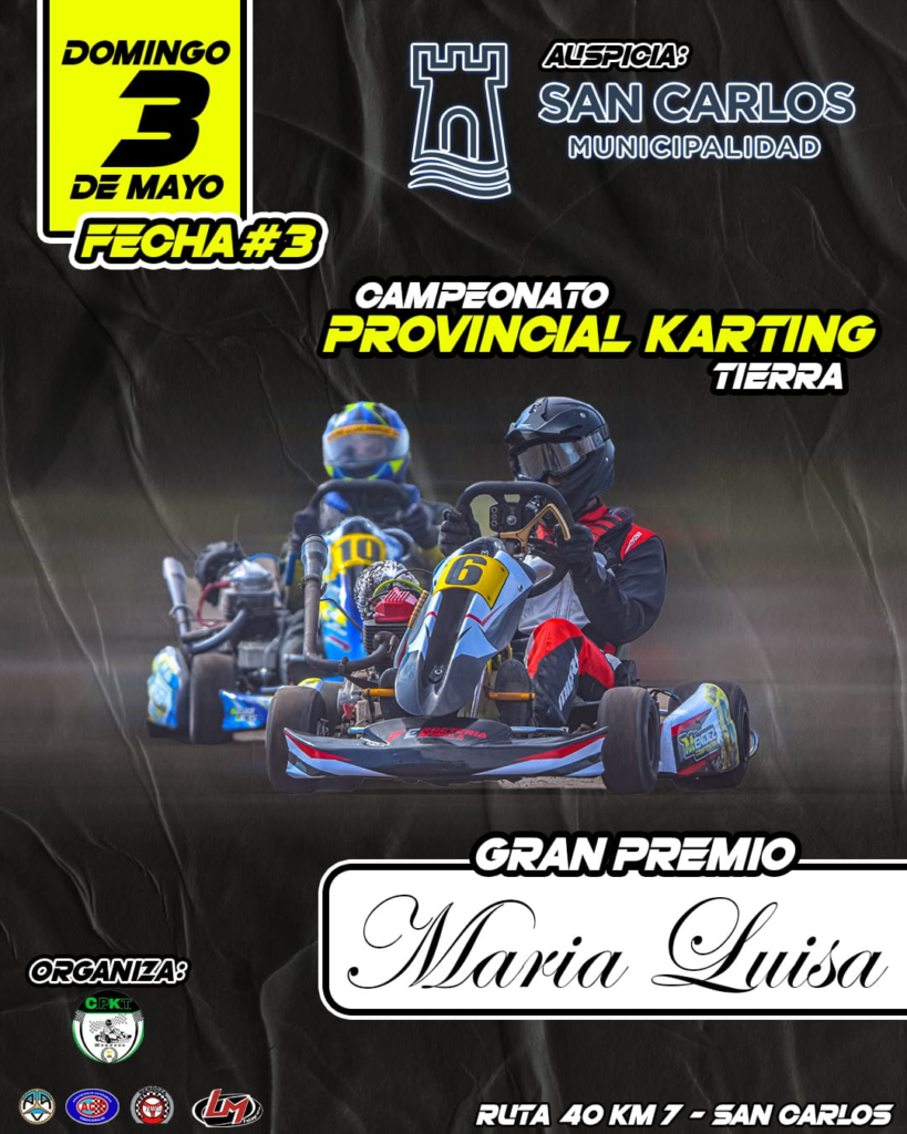 La Municipalidad de San Carlos invita a vecinos y visitantes a disfrutar de una jornada a pura velocidad, este domingo 3 de mayo desde las 10:00 horas, en el marco del Gran Premio “María Luisa”, correspondiente a la tercera fecha del Campeonato Provincial de Karting en tierra (CPKE).